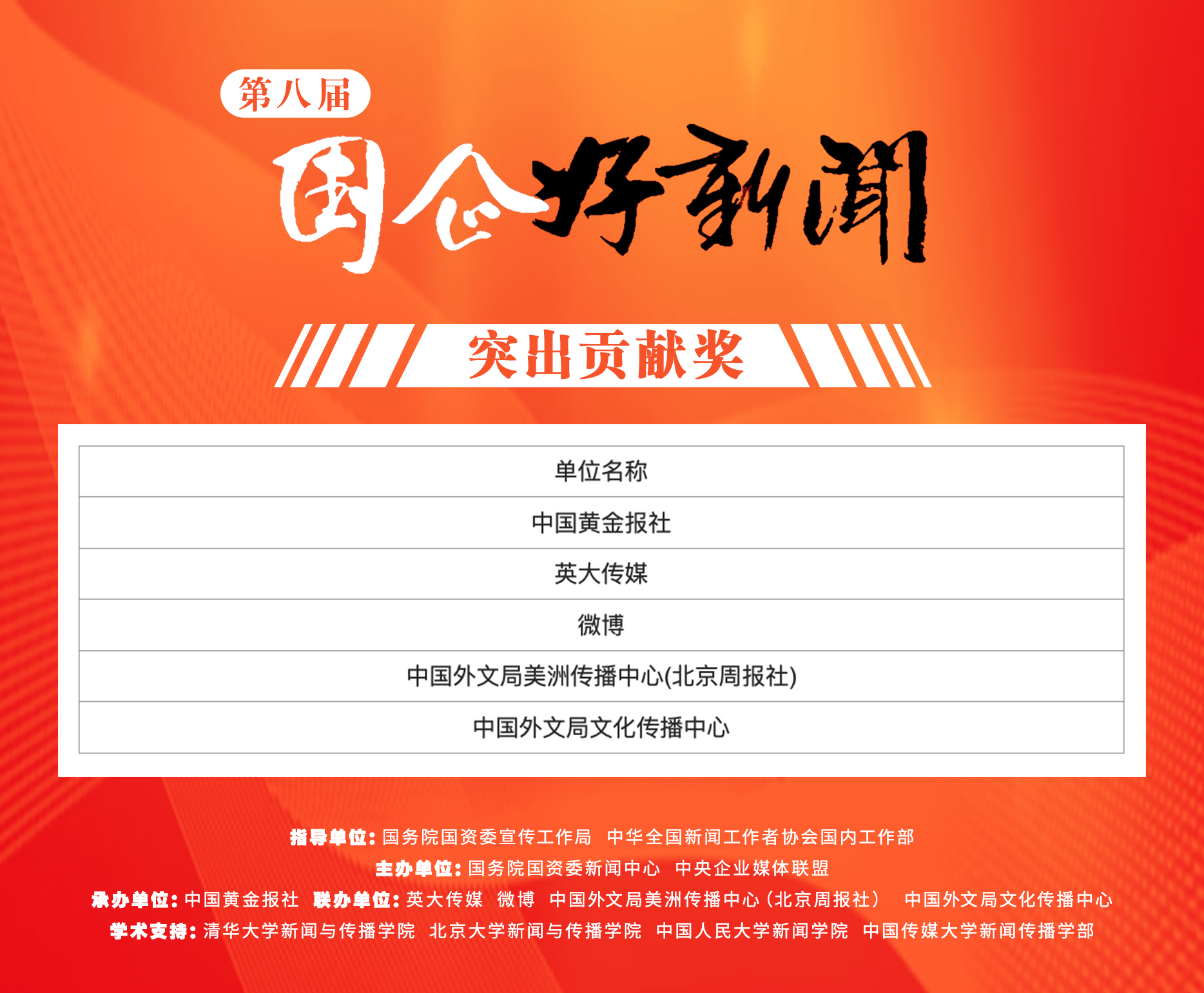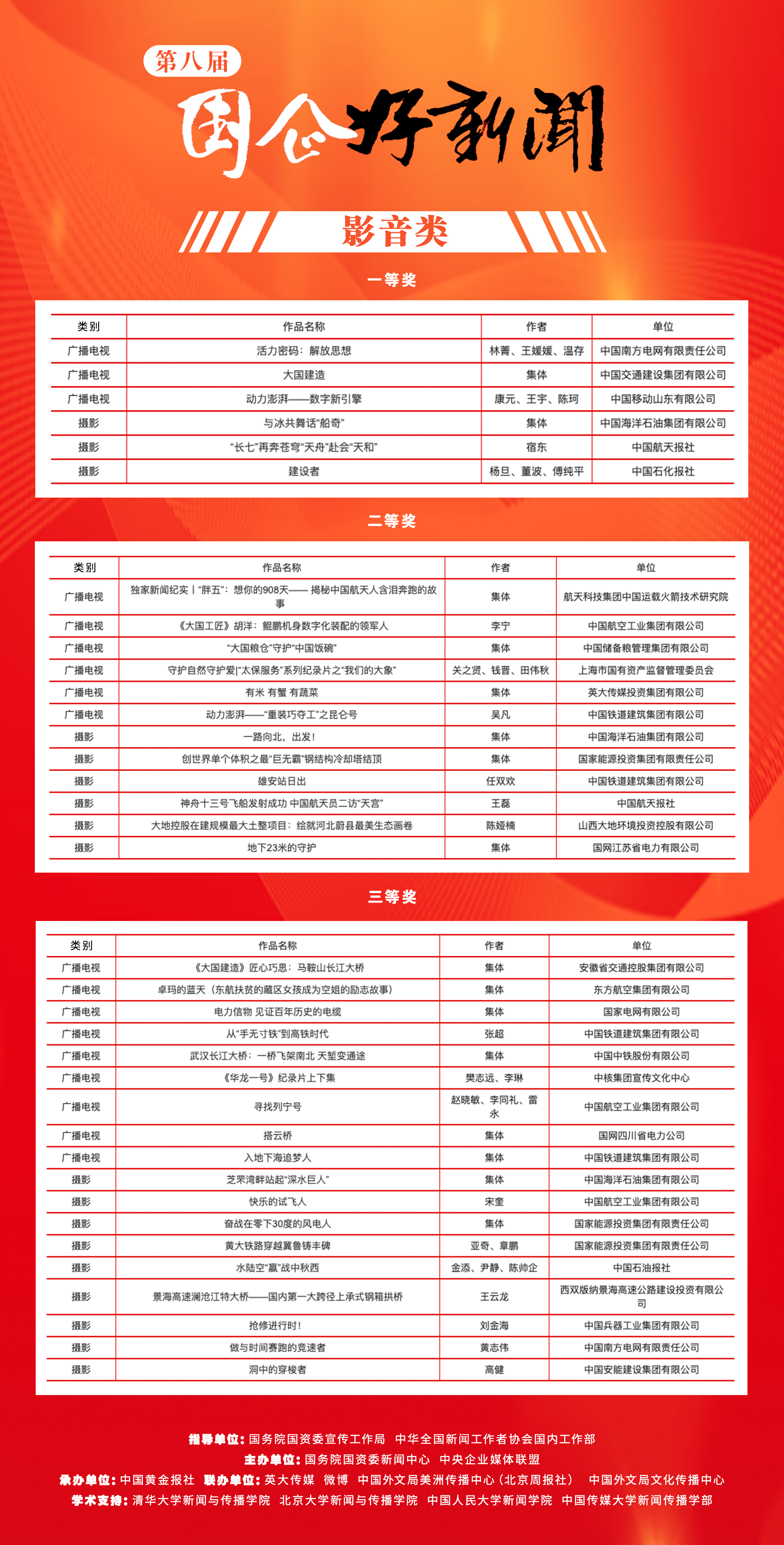 在國資委黨委的高度重視下,第八屆“國企好新聞”由國務院國資委宣傳工作局、中華全國新聞工作者協會國內工作部指導,國務院國資委新聞中心、中央企業媒體聯盟主辦,中國黃金報社承辦,英大傳媒、微博、中國外文局美洲傳播中心(北京周報社)、中國外文局文化傳播中心聯辦,清華大學新聞與傳播學院、北京大學新聞與傳播學院、中國人民大學新聞學院、中國傳媒大學新聞傳播學部提供學術支持。征集、評選歷時2個月,得到了國資國企、主流媒體、社會公眾的廣泛關注和積極參與,3772件新聞作品、73名新聞創客人選參評,138家國資國企單位報名,相比往屆量質齊升,社會影響力顯著增強。